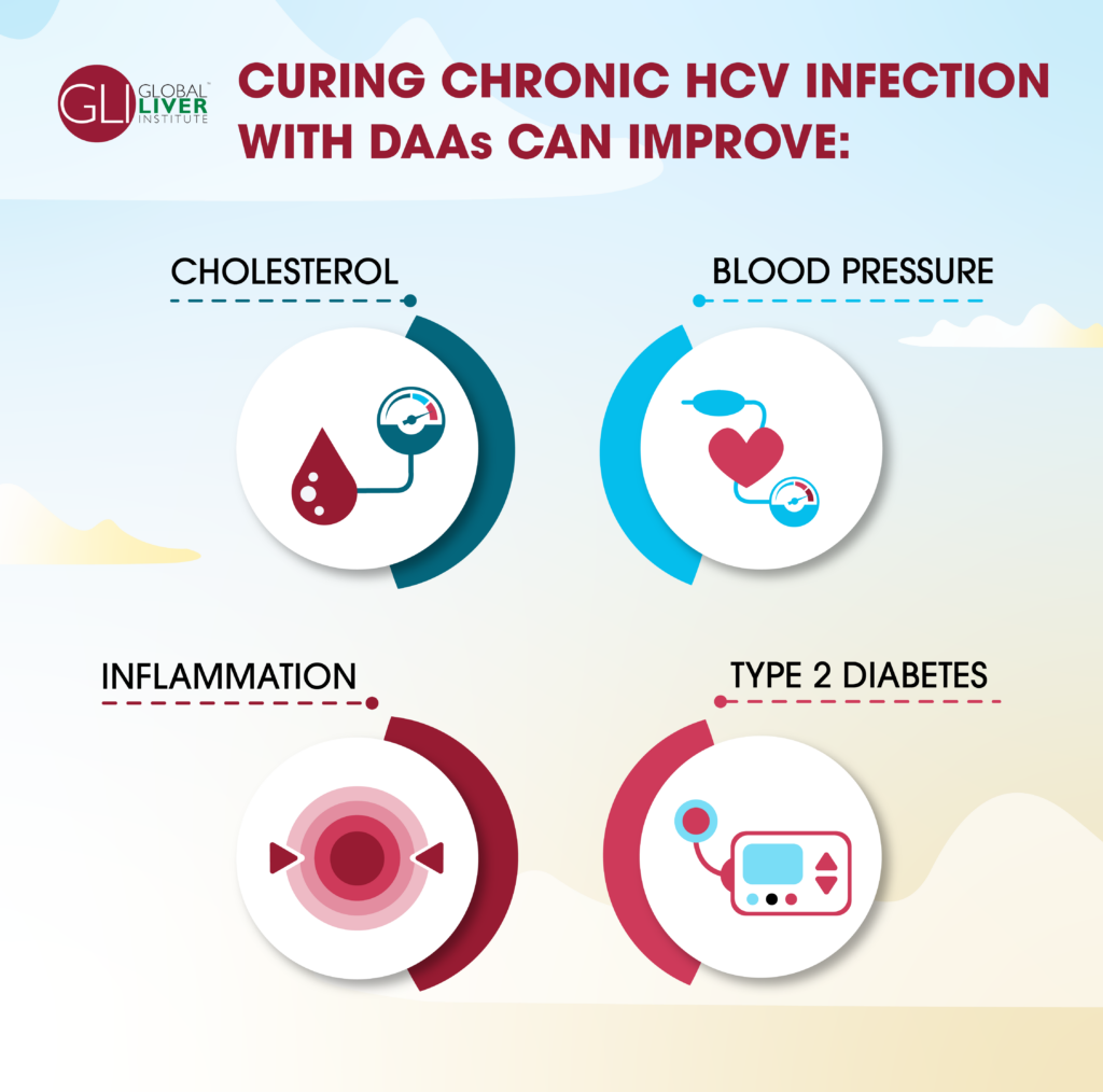 In a study of patients at several gastroenterology/hepatology practices in the U.S., one year after treatment, almost half of patients with diabetes saw the condition improve, and about a third of those reported improvements in cholesterol and blood pressure. This study included male and female participants from a variety of racial and ethnic backgrounds. The authors of the study suggest that because of the role of HCV in chronic inflammation and the importance of the liver, an improvement in liver health and function after curative treatment led to other improvements in health.